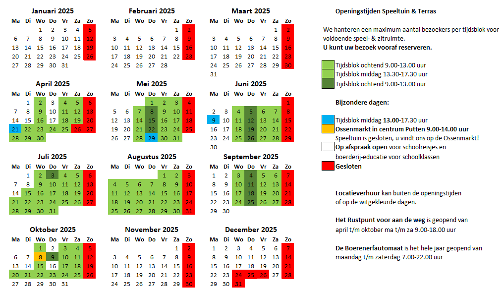 Op de dagen waarop wij geopend zijn bent u van harte welkom om een bezoek te brengen aan de speeltuin met boerderijdieren of het terras. In onderstaand overzicht staan onze openingstijden vermeld. Voor de speeltuin werken we met tijdsblokken, reserveren is aan te bevelen. We houden dan een maximum aantal bezoekers aan voor voldoende speel- en zitruimte.